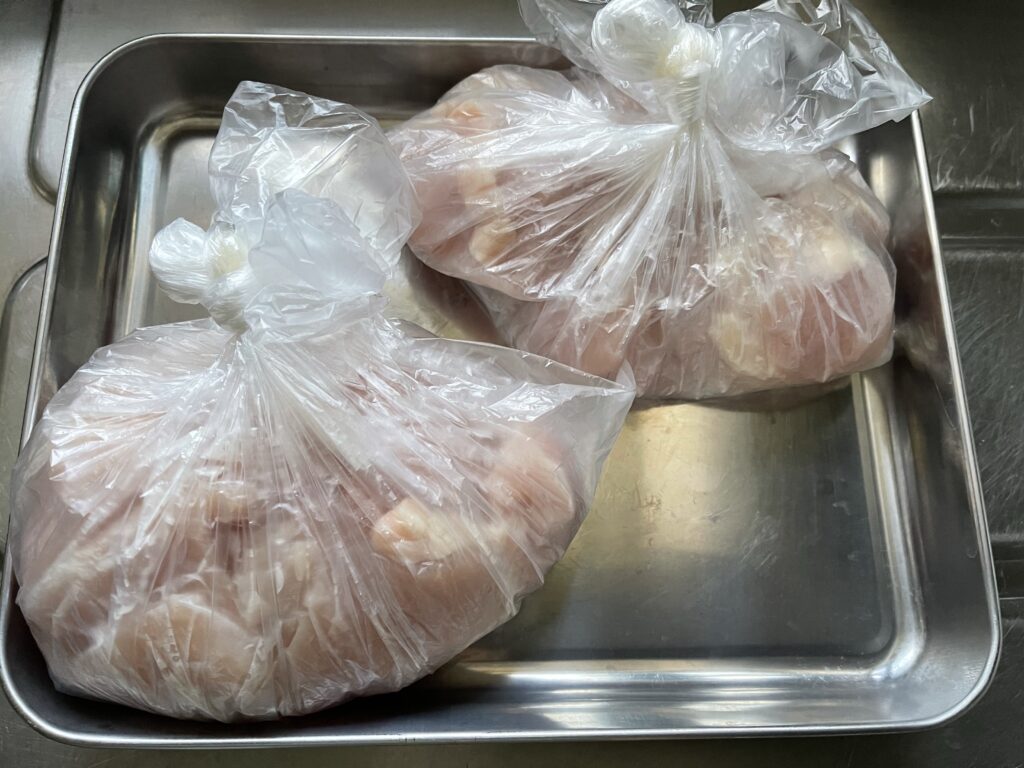 - 鶏むね肉に塩・胡椒してジップロック袋に入れてる。
