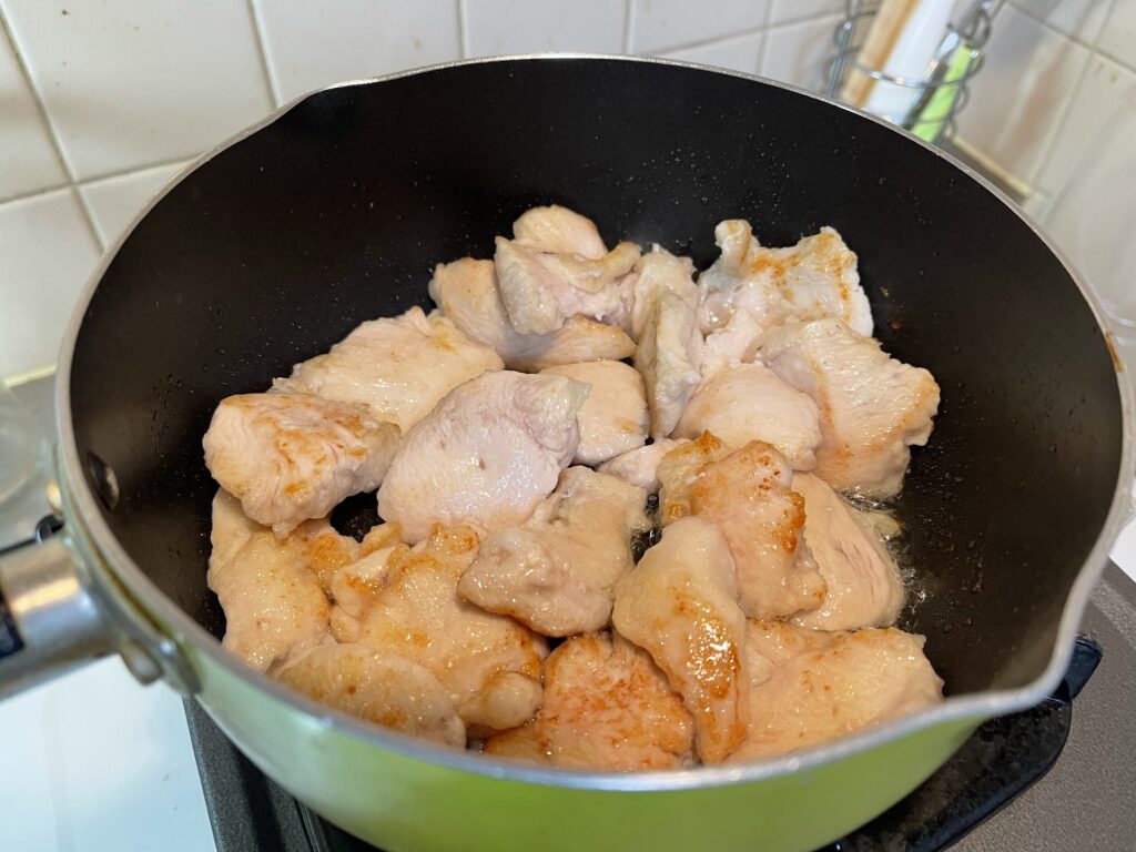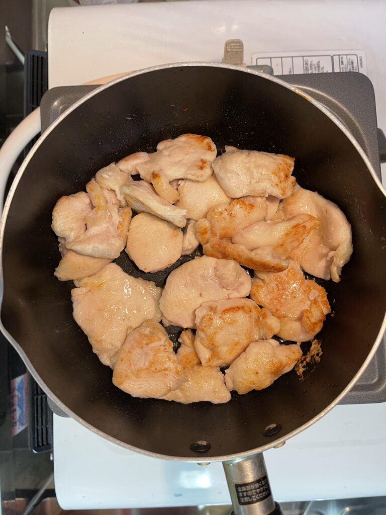 - 強火でフライパンに鶏むね肉が重ならないように広げて焼いていく。