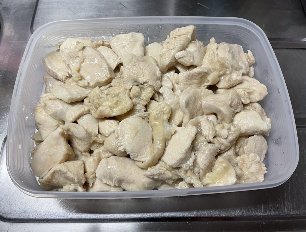 - 2kgの鶏むね肉を切り、ボールに入れる。