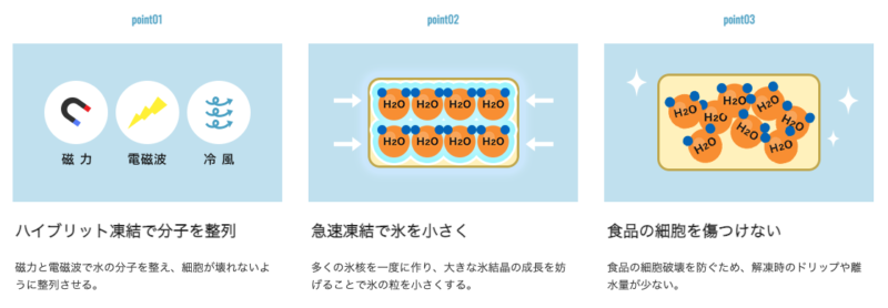 プロトン凍結は、食品・食材が凍る時の「氷の粒」をできるだけ大きくしないようにすることで、冷凍による劣化を抑えた状態で凍結します。