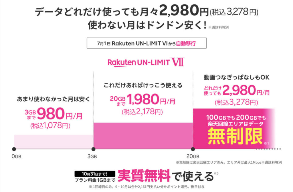 ※2022年11月1日(火)0:00〜「Rakuten UN-LIMIT VII」のプラン料金が適用されます。