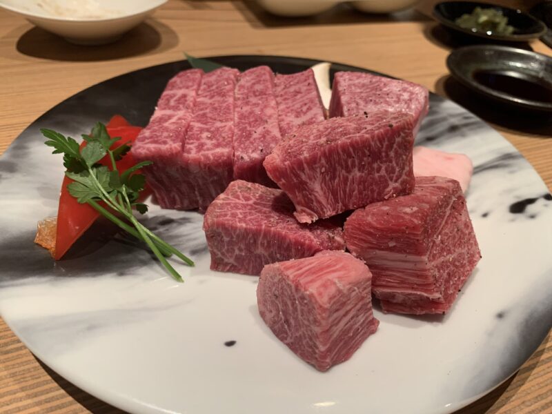 手前のサイコロ状のが和牛上ヒレで、奥のが和牛シャトーブリアン。