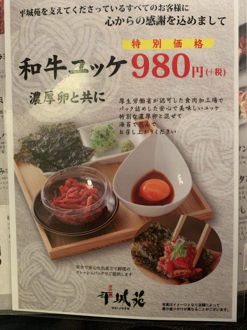 普段のグランドメニューでは和牛ユッケが1,380円なんですが、980円だと…