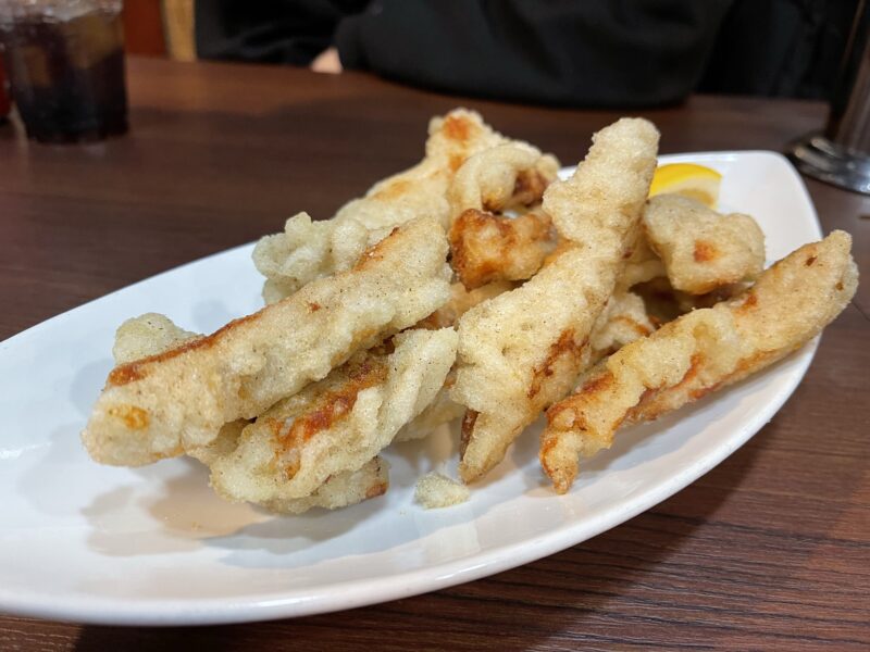 揚げ物とはわかるけど、衣が分厚すぎる上に細長いということもあって肉なのか野菜なのかさえもよくわからない。
