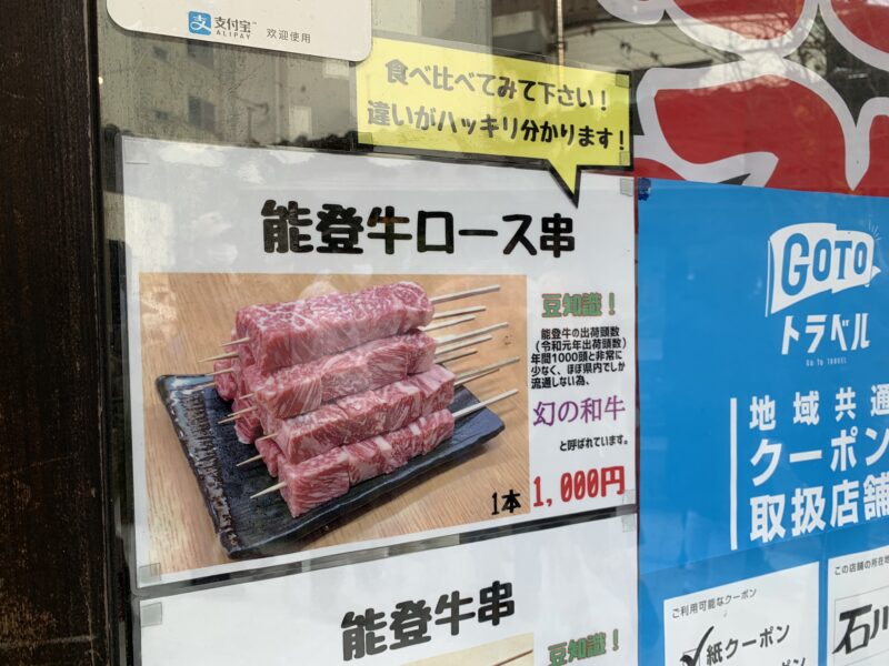 能登牛ロース串1本1,000円しますが、是非食べて欲しいおすすめの一品。