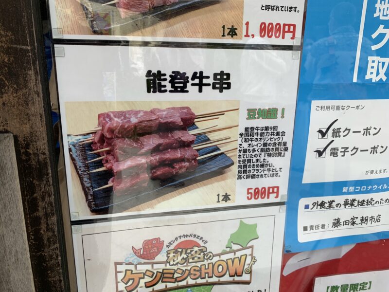それと一緒に能登牛串1本500円も一緒に食べ比べして欲しい!
