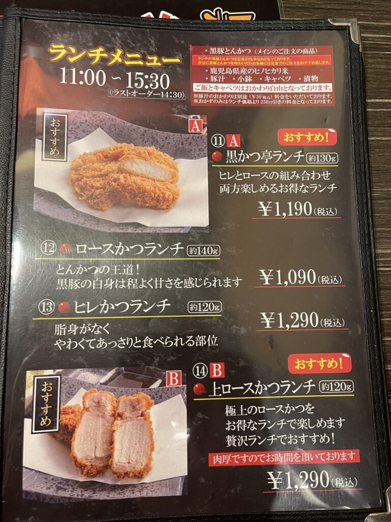 - 黒豚ロース&ヒレカツの両方を1度に楽しめる黒かつ亭ランチがお得!