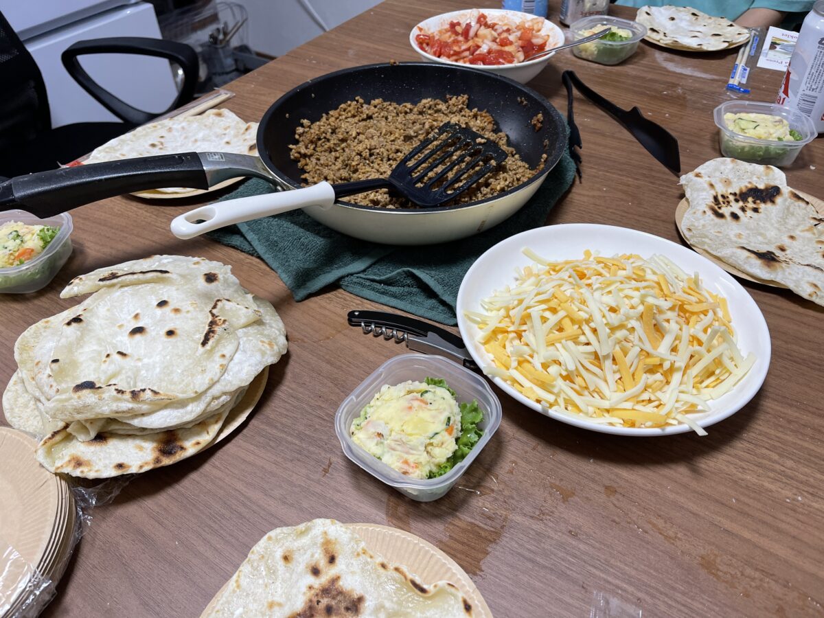 また、隣に住んでいる料理大好きアメリカ人(めっちゃ珍しい)の英語の先生が、自家製タコスを作ってタコパを開いてくれたり