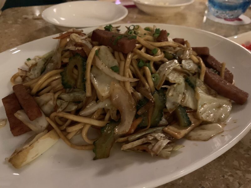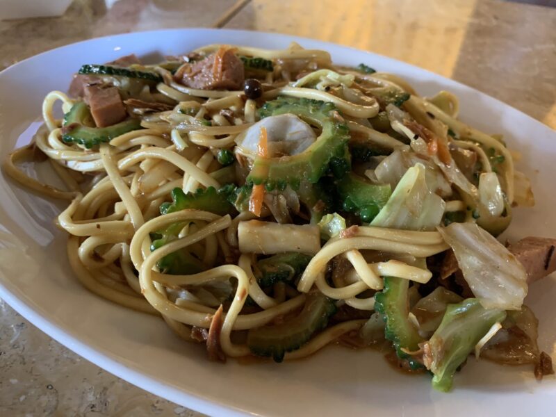 スパムとゴーヤが入っていて、この麺とソースが絡み合い沖縄感満載な焼きそば。