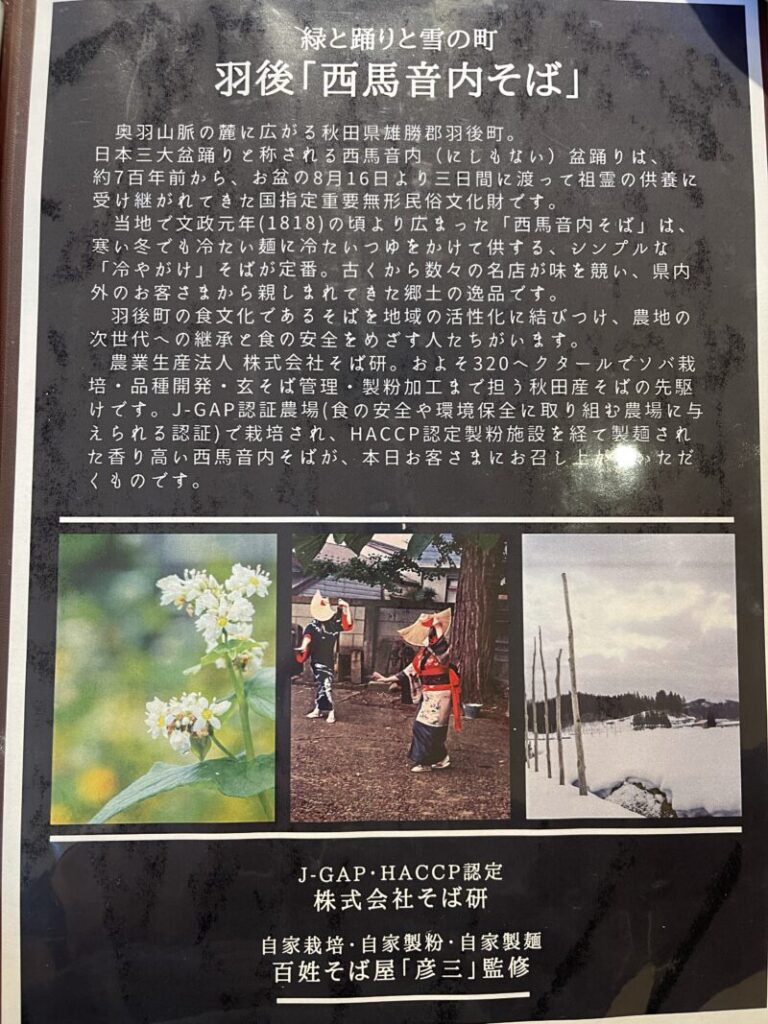 西馬音内(にしもない)の名店、自家製栽培・自家製粉・自家製麺の百姓そば屋「彦三」監修の冷やがけそば。