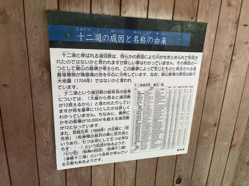 十二湖という湖沼群の総称名の由来については、「大崩(おおくずれ)から見ると湖沼数が12見えるから」と言われたりしますが、何を基準に12としたかは詳しくは分かっていません。