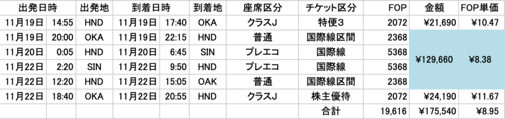 つまり、長距離便のロサンゼルスやニューヨークに行く便で稼ぐFOPとシンガポールやクアラルンプール便で稼ぐFOPと大差ないのです!